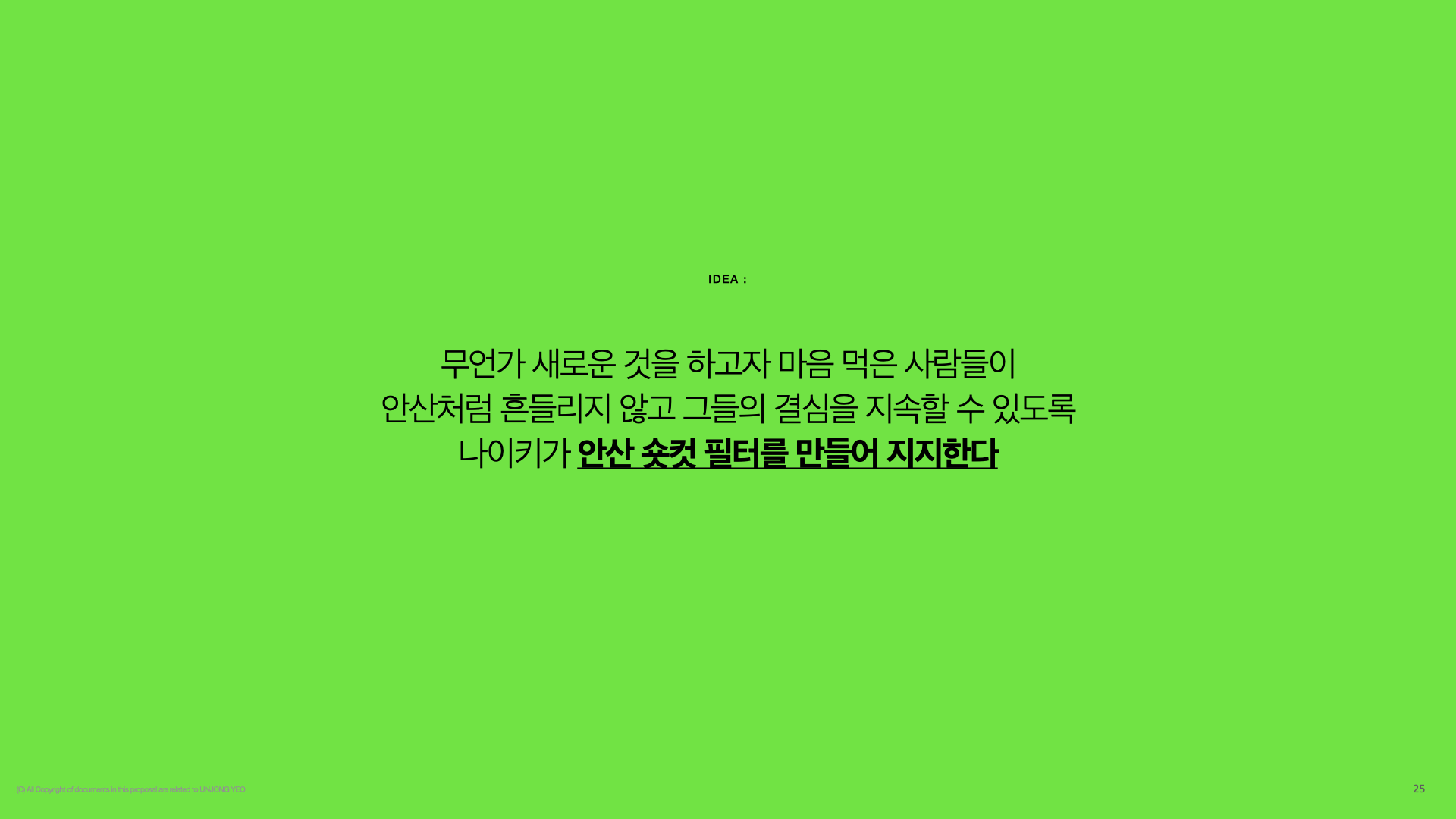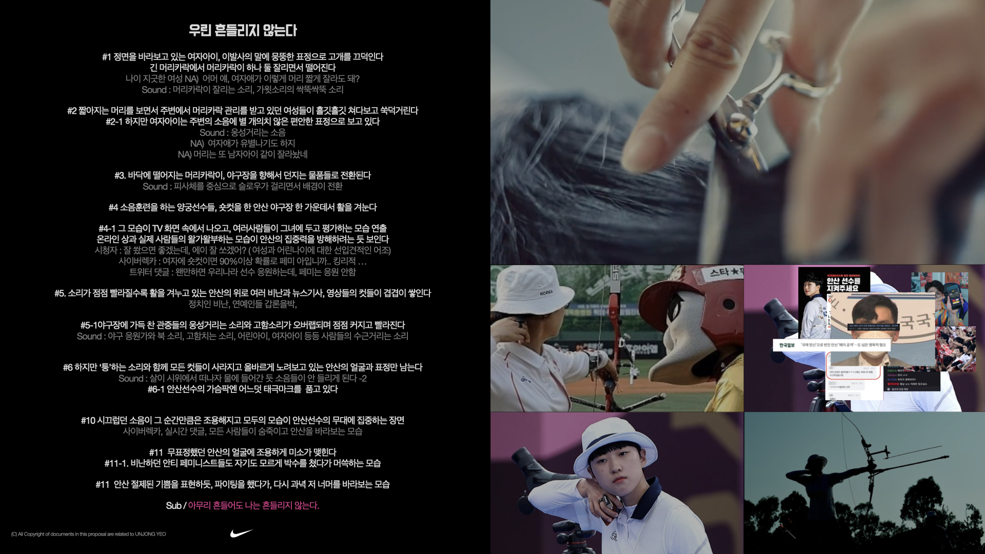 2021년에는 다이나믹한 해였습니다. 다양함, 동등함, 포용이란 가치가 중요한 가치로 대두되었죠. 하지만 실제로 한국에서 실현되지는 못하고 있었습니다. 국가대표 양궁 선수인 안산선수는 올림픽에서 여성이 짧은 머리를 했다는 이유만으로 비난을 받았었습니다. 하지만 안산선수는 주변의 비난에 흔들리지 않고 기록적인 금메달리스트가 될 수 있었습니다.그래서 저는 나이키에게, 여성들의 목소리와 연대감에 대해서 사회에 이슈가 될 수 있도록, 안산선수와 함께하는 캠페인을 제안합니다.
