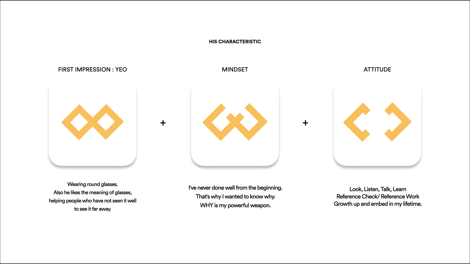 사람들의 기억 속에 저를 남기기 위한 포인트가 필요했습니다. 그래서 나의 태도나 특색, 스토리들을 하나의 심볼로 디자인했습니다.